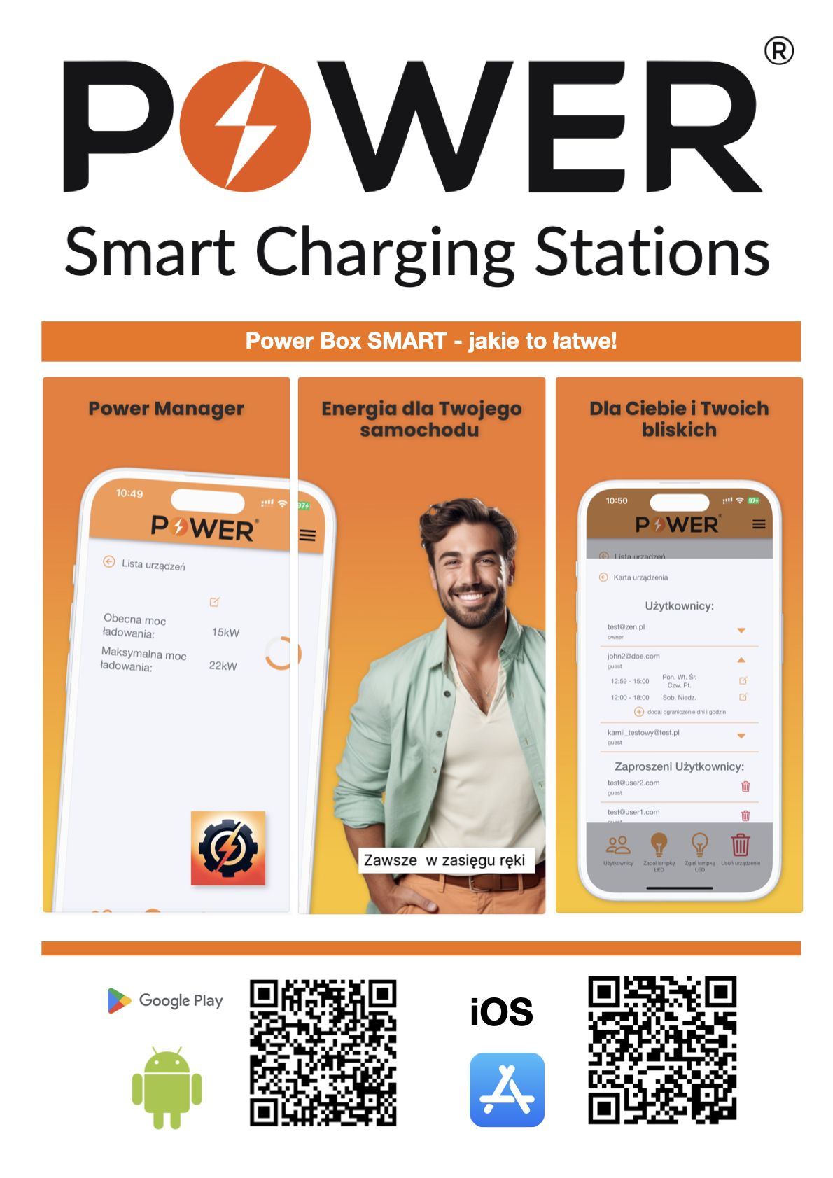 Stacja PowerBox 11kW to produkt zaprojektowany i wykonany w 100% w Polsce. Stacja PowerBox jest przystosowana do pracy na zewnątrz lub wewnątrz budynku. Zakres temperatury pracy stacji to od -45 stopni do +55 stopni PowerBox jest odporny na wodę i umożliwia ładownie pojazdu nawet podczas bardzo intensywnych opadów. Umożliwiająca załączanie ładowania automatycznie po wykryciu podłączonego pojazdu lub po autoryzacji za pomocą karty RFiD (NFC). Gwarancja producenta stacji 24 m-ce.
